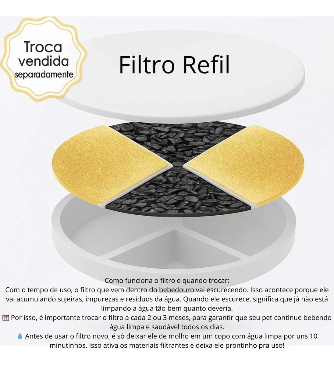 Para manter a eficácia da filtragem, recomenda-se a troca do filtro a cada 2 a 3 meses. Antes do primeiro uso, deixe o filtro novo mergulhado em água limpa por 10 minutos.