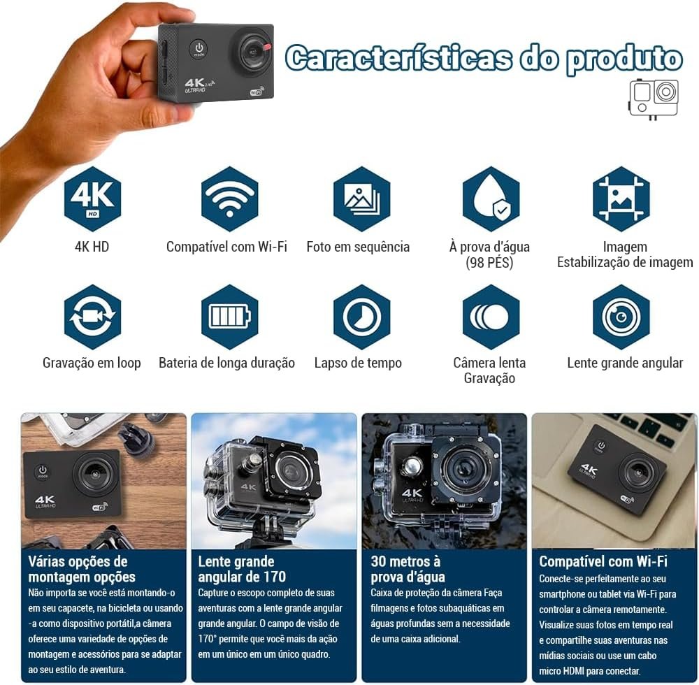 Seu design compacto e resistente a torna perfeita para qualquer cenário, e com a proteção à prova d’água, você pode filmar debaixo d’água sem preocupações. O kit inclui acessórios essenciais para fixar a câmera em capacetes, bicicletas, pranchas e onde mais sua aventura te levar, garantindo que você capture cada ângulo com perfeição.