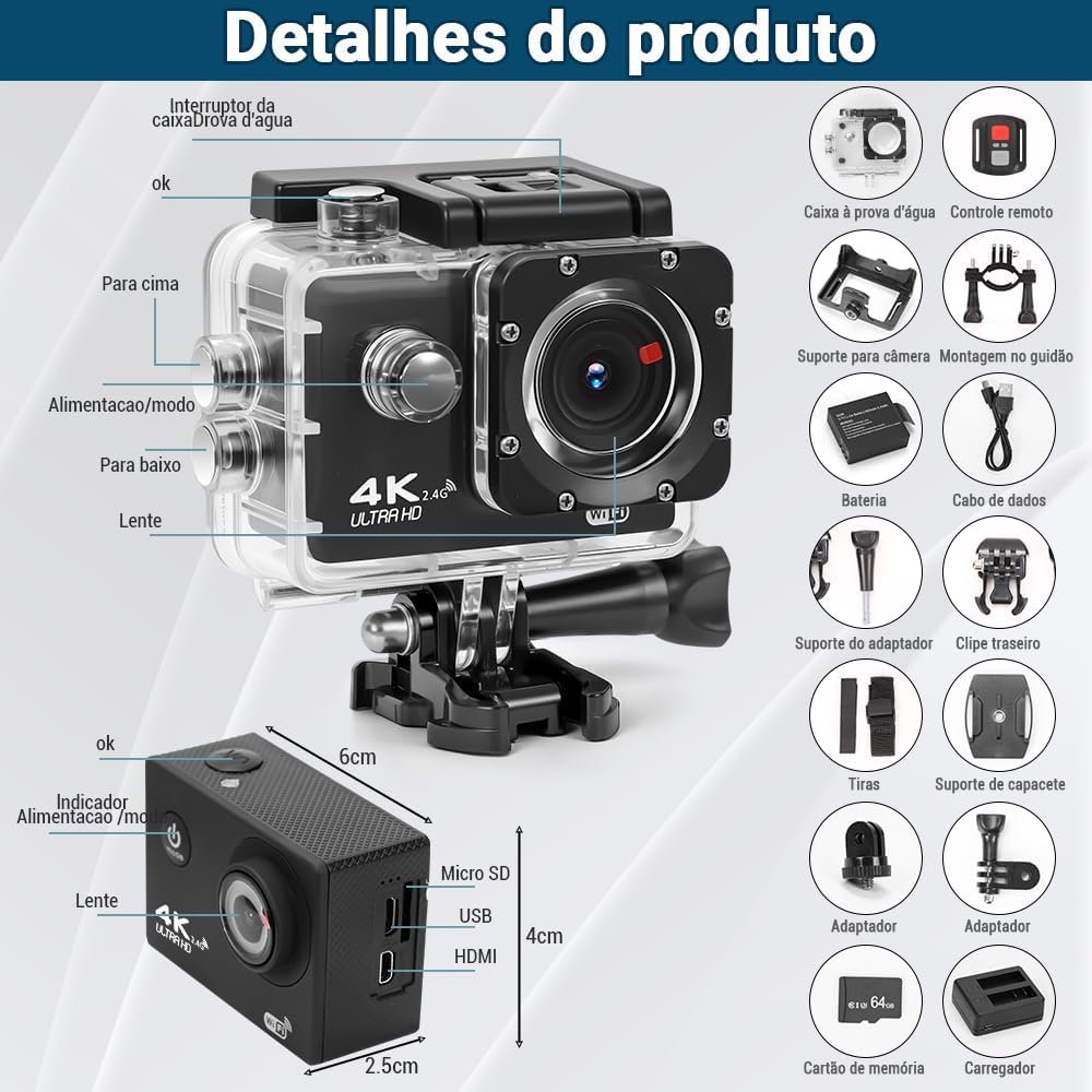 Capture cada momento com a máxima qualidade. A Câmera de Ação 4K Sports Ultra HD é a parceira ideal para registrar suas aventuras, esportes radicais e vlogs com imagens impressionantes. Compacta, robusta e cheia de recursos, ela foi feita para quem não quer perder nenhum detalhe.
