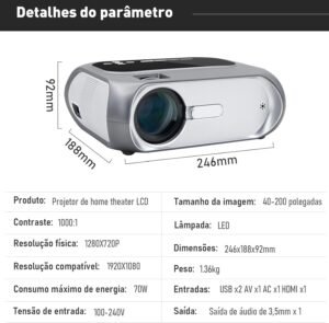 resolução nativa Full HD (1920 × 1080), contraste de 3000:1 e lâmpada LED de 51 W. A projeção cobre distâncias entre 1 e 5 metros, dependendo do espaço disponível.